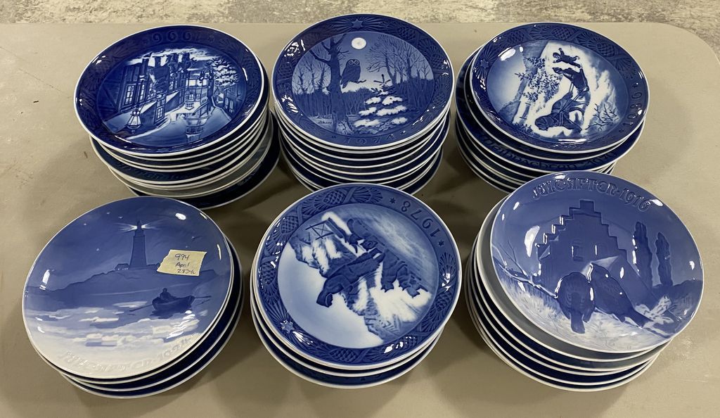 Group of Royal Copenhagen Collector Plates, Some Christmas Editions, 45 total, Location Front White Shelves, 1st shelf Group of Royal Copenhagen Collector Plates, Some Christmas Editions, 45 total, Location Front White Shelves, 1st shelf