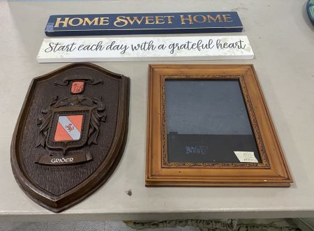 Grouping of Home Decor. Includes empty Picture Frame, Family Crest Plaque, and 2 Wall Signs Hangers, Location: Back Metal Cases/Frontside Grouping of Home Decor. Includes empty Picture Frame, Family Crest Plaque, and 2 Wall Signs Hangers, Location: Back Metal Cases/Frontside
