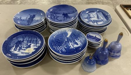 Group of Royal Copenhagen Collector Plates and bells, 39 plates and 3 bells. Location Front White Shelves, 2nd shelf Group of Royal Copenhagen Collector Plates and bells, 39 plates and 3 bells. Location Front White Shelves, 2nd shelf