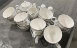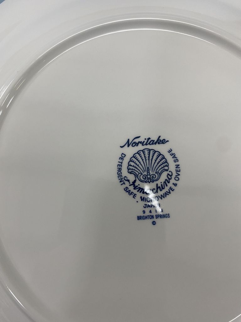 Set of Noritake Rimachina China. Includes 12 Dinner Plates, 12 Saucers, 12 Tea Cups, 12 Small Plates, 12 Salad Plates, Serving Bowl, Sugar and Milk, Salt and Pepper Shakers, and Platter. Location: Back Metal Cases/Frontside Set of Noritake Rimachina China. Includes 12 Dinner Plates, 12 Saucers, 12 Tea Cups, 12 Small Plates, 12 Salad Plates, Serving Bowl, Sugar and Milk, Salt and Pepper Shakers, and Platter. Location: Back Metal Cases/Frontside