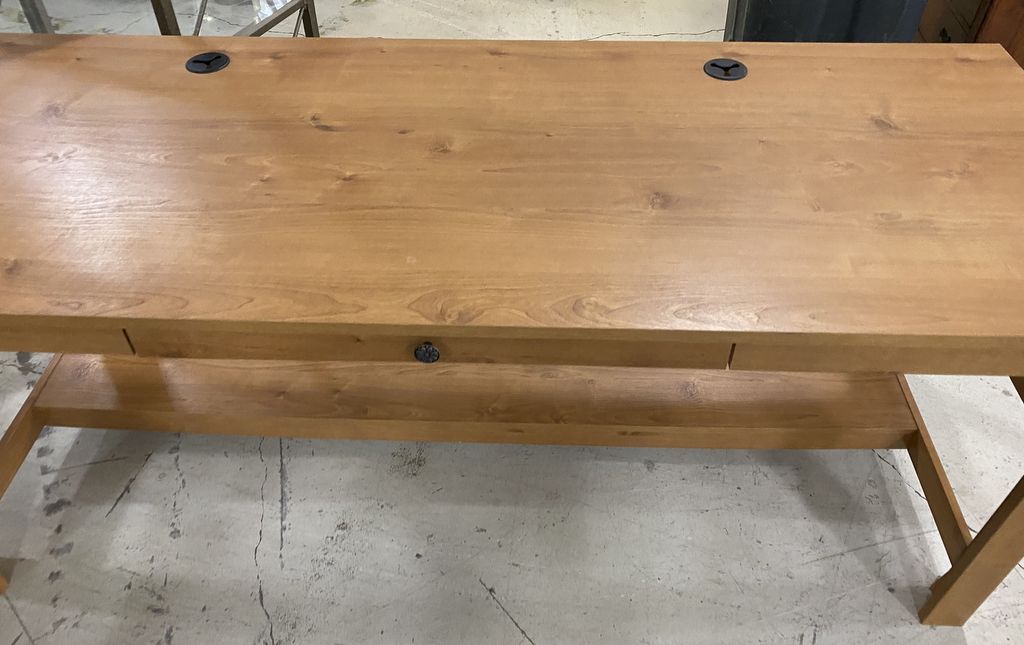 Press Wood Office Desk, single drawer, feet caps need work, 29"h.,72"w., 28"d. Location Right Side 1st Rows Press Wood Office Desk, single drawer, feet caps need work, 29"h.,72"w., 28"d. Location Right Side 1st Rows