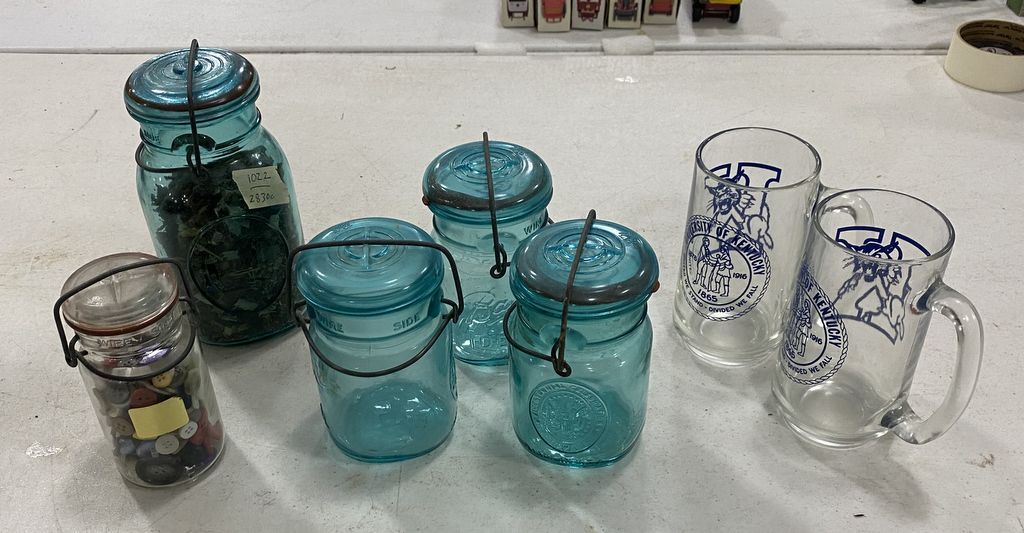 Grouping of Mason Jars and Pair of Handled Drinking Glasses. 3 Aqua Blue Mason Jars, 1 Mason Jar With Buttons, 1 Mason Jar With Potpourri, 2 Unversity of Kentucky Glasses. Grouping of Mason Jars and Pair of Handled Drinking Glasses. 3 Aqua Blue Mason Jars, 1 Mason Jar With Buttons, 1 Mason Jar With Potpourri, 2 Unversity of Kentucky Glasses.