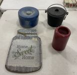 Grouping of Household Items. Home Sweet Home Wall Hanger, Candle, Antique Cast Iron Bean Pot Kettle With Lid, Primitive Blue Ceramic Pantry Crock With Lid. Grouping of Household Items. Home Sweet Home Wall Hanger, Candle, Antique Cast Iron Bean Pot Kettle With Lid, Primitive Blue Ceramic Pantry Crock With Lid.