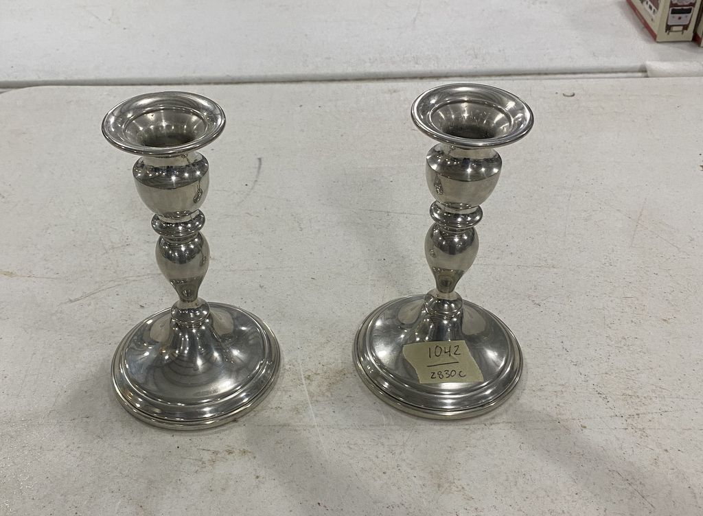 Pair of Pewter Candle Sticks. Weighted With 407 48 5738 Etched On Bottom. Location: Back White Cases Pair of Pewter Candle Sticks. Weighted With 407 48 5738 Etched On Bottom. Location: Back White Cases