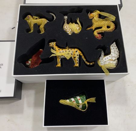 Set of 6 Cloisonne Ornaments, and Cloisonne Christmas Tree Ornament. Location Front White Shelves, 4th shelf Set of 6 Cloisonne Ornaments, and Cloisonne Christmas Tree Ornament. Location Front White Shelves, 4th shelf