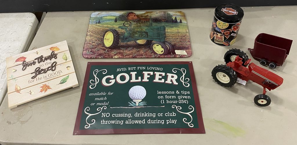 Grouping of Household Items. Includes Golfer Tin Sign, Glass Placemat With Tractor, Wooden Bible Verse Hanger, Model Tractor, Model Horse Trailer, and Harley-Davidson Motorcycles Nesting Decorative Tin Cans. Location: Back Metal Cases/Frontside Grouping of Household Items. Includes Golfer Tin Sign, Glass Placemat With Tractor, Wooden Bible Verse Hanger, Model Tractor, Model Horse Trailer, and Harley-Davidson Motorcycles Nesting Decorative Tin Cans. Location: Back Metal Cases/Frontside