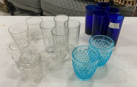 Grouping of Assorted Drinking Glasses. Incudes 5 Blue Drinking Glasses, 4 Drinking Glasses, 2 Plastic Glasses, and Other Misc Glasses. Grouping of Assorted Drinking Glasses. Incudes 5 Blue Drinking Glasses, 4 Drinking Glasses, 2 Plastic Glasses, and Other Misc Glasses.