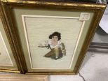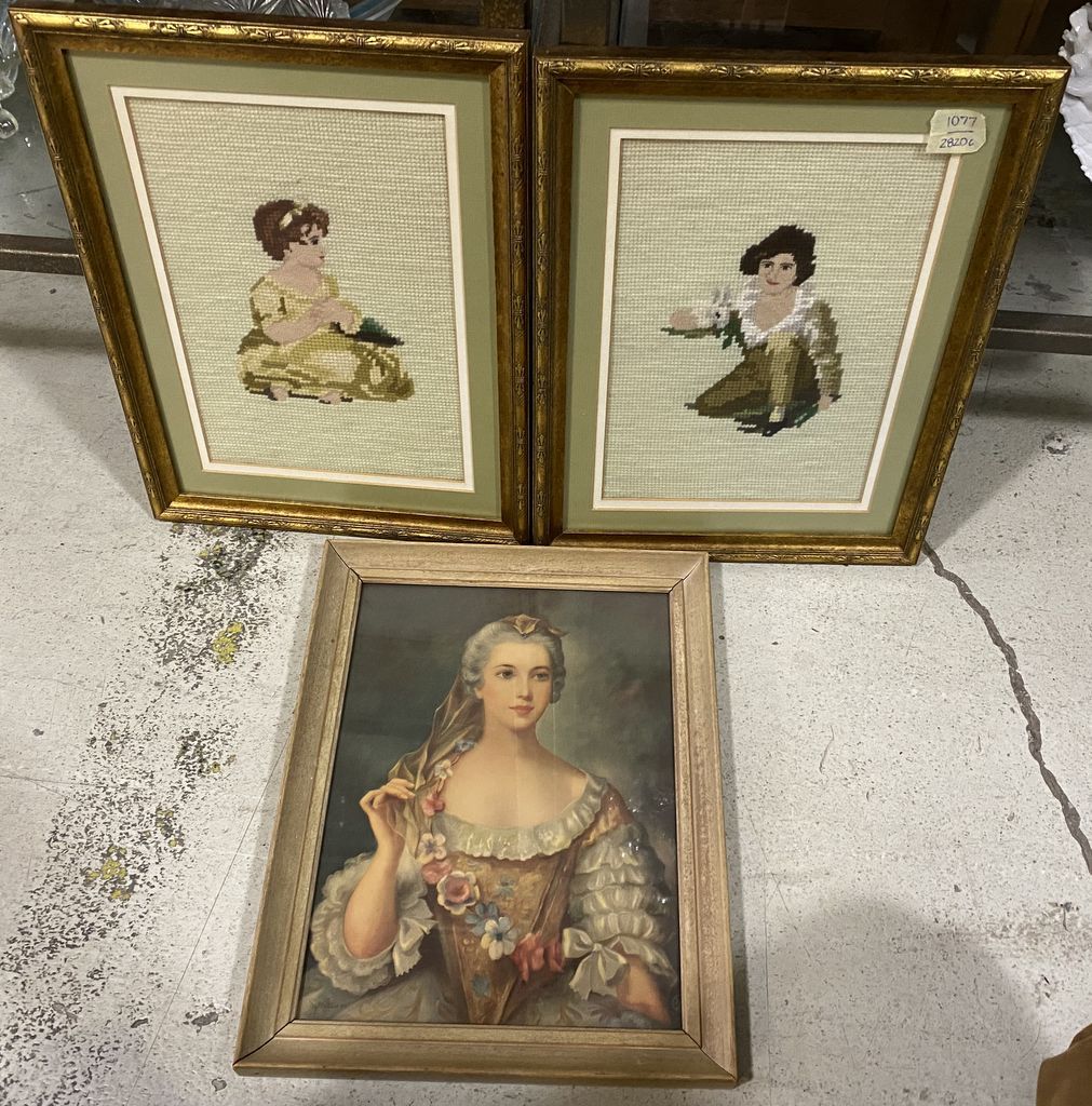 1077 Pair of Framed Needlepoints Age of Innocence and Framed Print of Lady