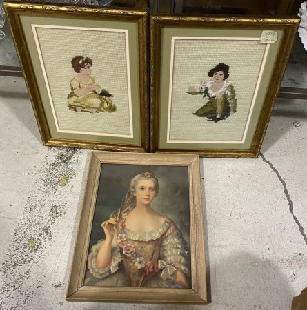 Pair of Framed Needlepoints Age of Innocence and Framed Print of Lady. Location Right Metal Cases by Office Pair of Framed Needlepoints Age of Innocence and Framed Print of Lady. Location Right Metal Cases by Office