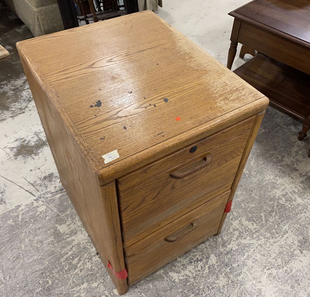 Oak Two Drawer File Cabinet, worn finish, functional, 30"h., 20"w., 24"d. Location Right Side 7th Row Oak Two Drawer File Cabinet, worn finish, functional, 30"h., 20"w., 24"d. Location Right Side 7th Row