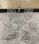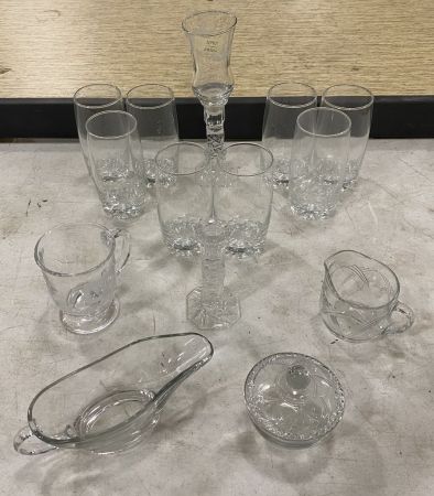 Grouping of Assorted Glassware. Includes Set of 8 Drinking Glasses, 1 Decorative Candle Holder, 1 Clear Glass Stick Candle Holder, and Other Misc Glassware. Location: Back Metal Cases/Frontside Grouping of Assorted Glassware. Includes Set of 8 Drinking Glasses, 1 Decorative Candle Holder, 1 Clear Glass Stick Candle Holder, and Other Misc Glassware. Location: Back Metal Cases/Frontside