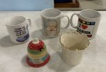 1096 Group of Coffee Mugs, Gail Pittman Hand Painted Bell, and Decorative Porcelain Candle Holder