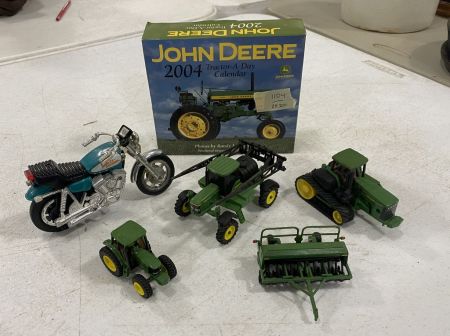 Group of Model John Deere Tractors, 1 Attachment, Motorcycle and 2004 Tractor-A-Day Calendar In Box. Location: Back Metal Cases/Frontside Group of Model John Deere Tractors, 1 Attachment, Motorcycle and 2004 Tractor-A-Day Calendar In Box. Location: Back Metal Cases/Frontside