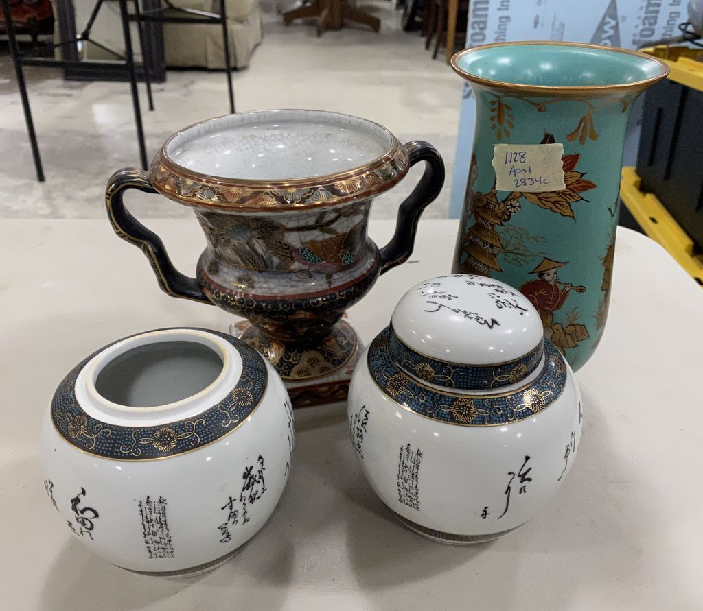 Hand Painted Chinese urn, Chinese Vase, pair of Japanese jars, one missing lids. Location Right Metal Cases by Office Hand Painted Chinese urn, Chinese Vase, pair of Japanese jars, one missing lids. Location Right Metal Cases by Office
