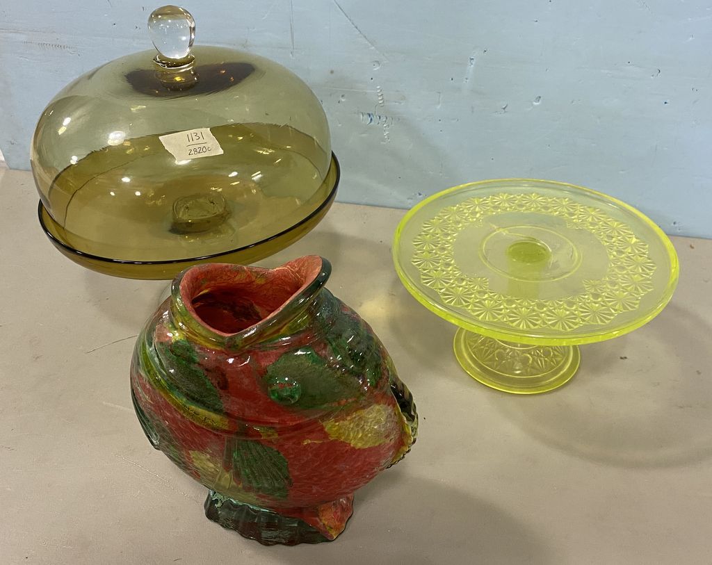 1131 Colored Cake Dome and Pedestal, Art Deco Goldfish Flower Vase, and 1 Cake Pedestal Plate.