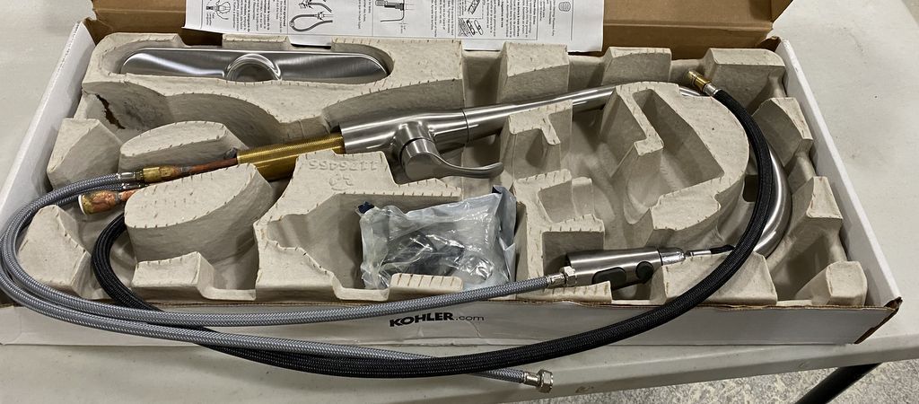 Kohler Pull Down Kitchen Faucet, 596-VS, stainless steel, used, in box. Location Front of Screen Kohler Pull Down Kitchen Faucet, 596-VS, stainless steel, used, in box. Location Front of Screen