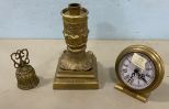 1136 Grouping of Brass Decorative Candle Base, 1 Brass Bell, 1 Brass Clock