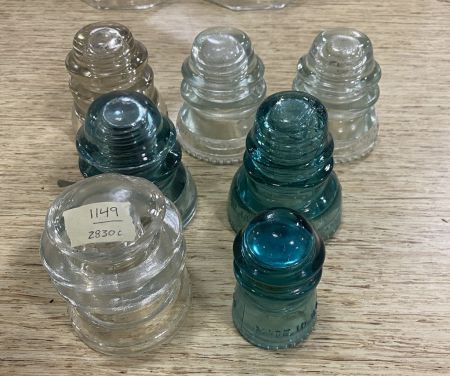 Grouping of Assorted Vintage Hemingray Glass Telegraph Insulators. 7 total. Location: Back Metal Cases/Frontside Grouping of Assorted Vintage Hemingray Glass Telegraph Insulators. 7 total. Location: Back Metal Cases/Frontside