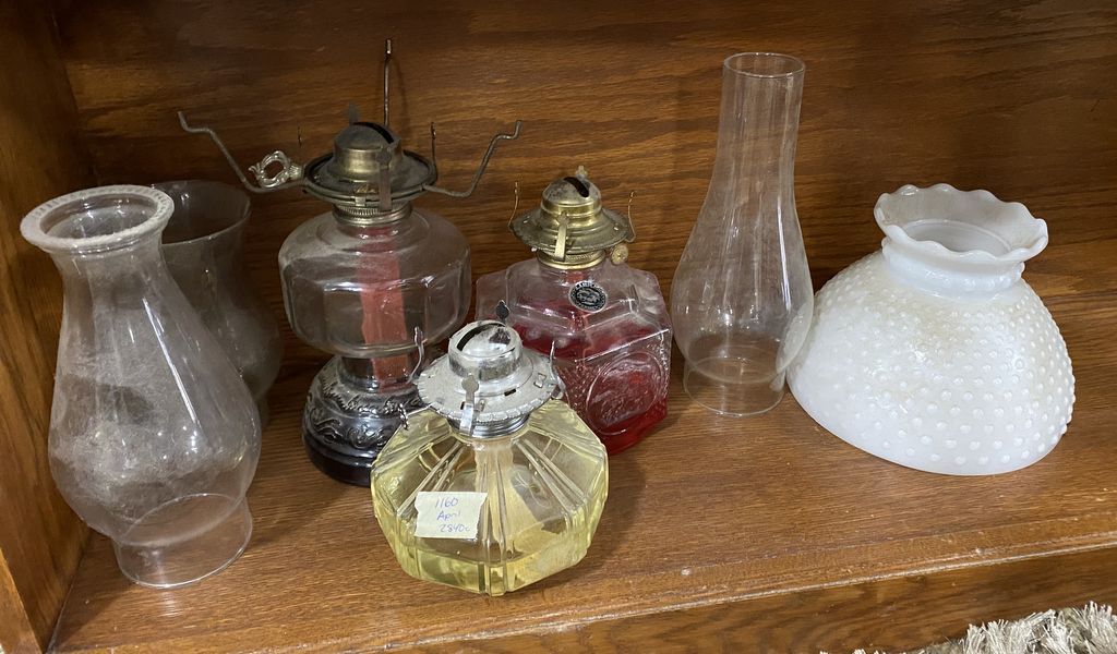 Three Vintage Glass Oil Lamps, hurricane shades, one with milk glass shades. Location Front of Screen Three Vintage Glass Oil Lamps, hurricane shades, one with milk glass shades. Location Front of Screen