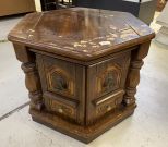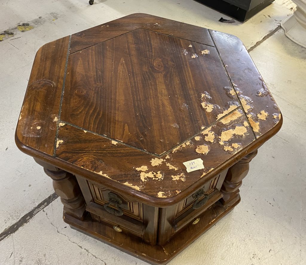 Worn 1970's Octagon Lamp Table, worn finish, 19"h., 24"dia. Location: Left Side 6th Row Worn 1970's Octagon Lamp Table, worn finish, 19"h., 24"dia. Location: Left Side 6th Row