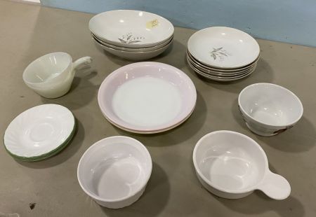 Grouping of Assorted Porcelain Plates and Small Serving Dishes. Includes Set of Kaysons China, Color Rimmed Pyrex Dishes, Oven Handled Colored Dishes, Set of Saucers, 2 Oven Small Dishes, and Bowl With Base. Location: Black Silver Metal Shelves Grouping of Assorted Porcelain Plates and Small Serving Dishes. Includes Set of Kaysons China, Color Rimmed Pyrex Dishes, Oven Handled Colored Dishes, Set of Saucers, 2 Oven Small Dishes, and Bowl With Base. Location: Black Silver Metal Shelves
