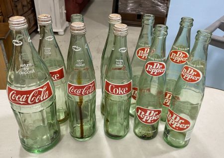 Group of Vintage Coke and Dr Pepper Glass Bottles, 10 total. Location: Black Silver Metal Shelves Group of Vintage Coke and Dr Pepper Glass Bottles, 10 total. Location: Black Silver Metal Shelves