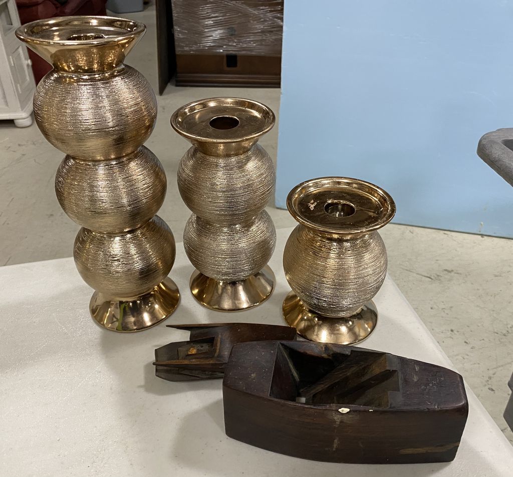 Three Ceramic Gold Candle Holders and Wood Planer, Location: Black Silver Metal Shelves Three Ceramic Gold Candle Holders and Wood Planer, Location: Black Silver Metal Shelves