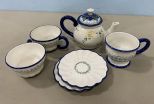 Porcelain Pitcher, Cups, and Saucers, made in China. Location: Back Metal Cases/Backside Porcelain Pitcher, Cups, and Saucers, made in China. Location: Back Metal Cases/Backside