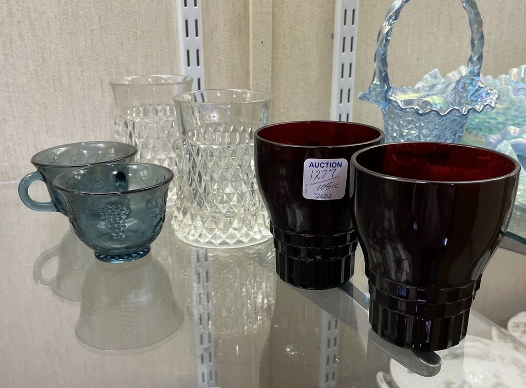 2 Ruby Red Glasses, 2 Glass Mugs, And 2 Coffee Cups, Location Back Tall White Cases 2 Ruby Red Glasses, 2 Glass Mugs, And 2 Coffee Cups, Location Back Tall White Cases