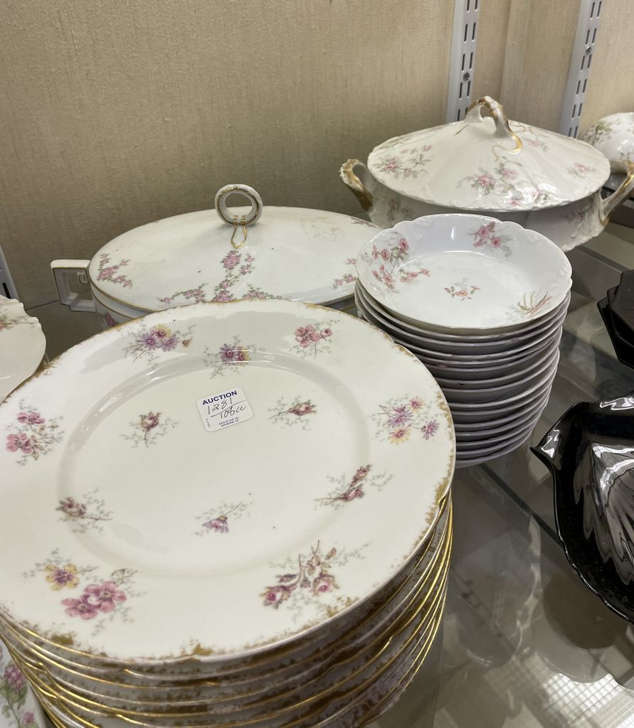 Haviland Limoges China Including 3 Covered Dishes And Assortment Of Plates And 2 Bowls, Location Back Tall White Cases Haviland Limoges China Including 3 Covered Dishes And Assortment Of Plates And 2 Bowls, Location Back Tall White Cases