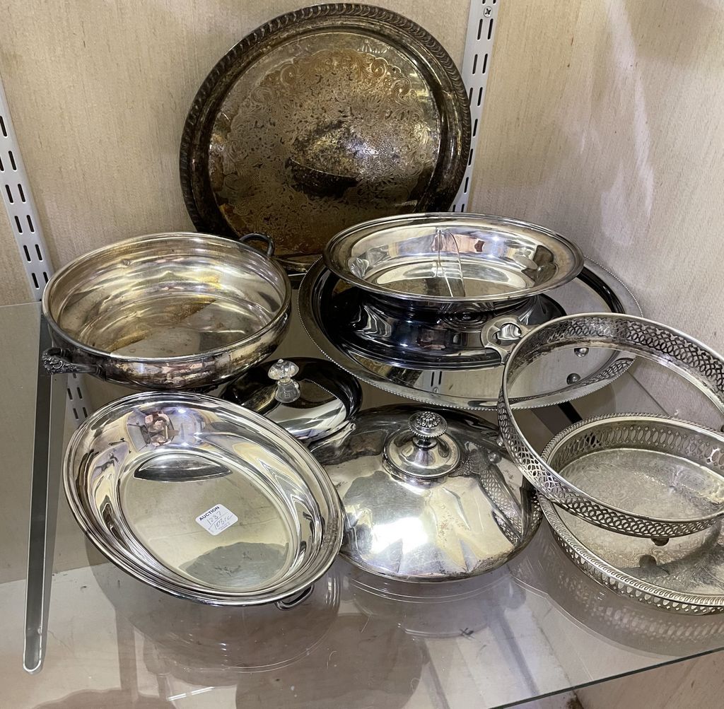 Grouping of Assorted Silver Plate, vegetable dish, trays, platters. Location Back Tall White Cases Grouping of Assorted Silver Plate, vegetable dish, trays, platters. Location Back Tall White Cases