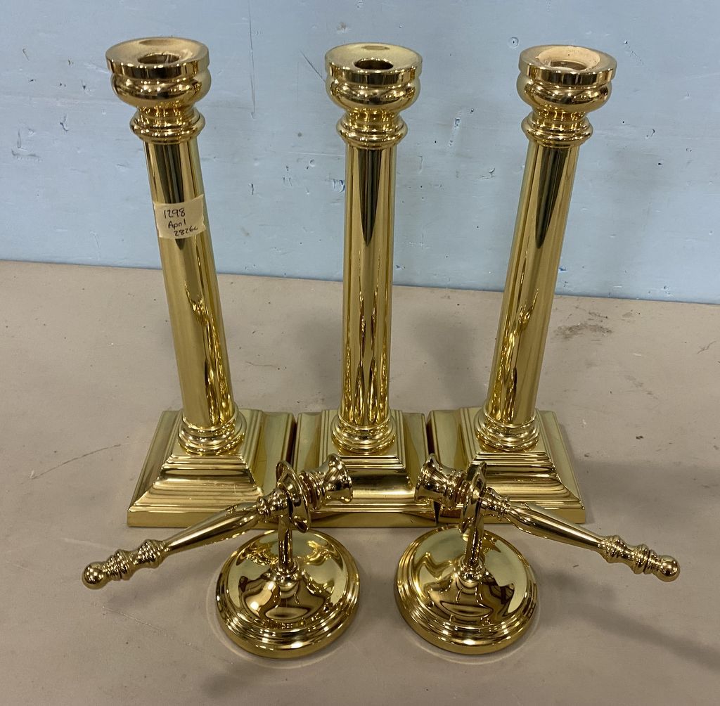 1298 Three Tall Brass Candle Holders and Two Brass Wall Candle Sconces