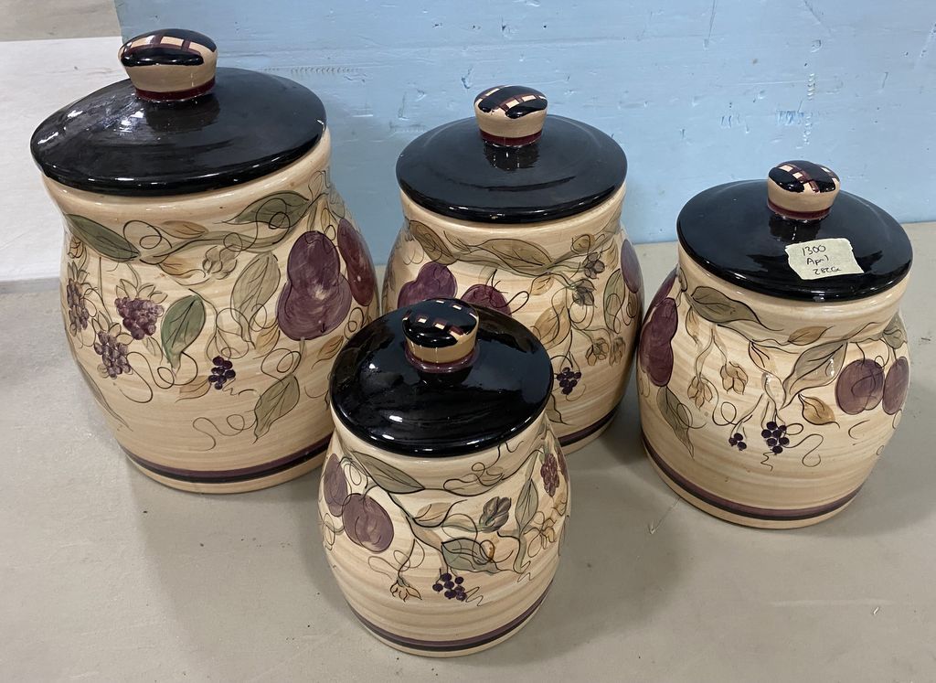 Four Hand Painted Canisters, with lids, one has rim, 9"h. Location: Back White Cases Four Hand Painted Canisters, with lids, one has rim, 9"h. Location: Back White Cases