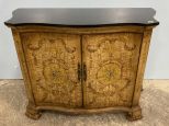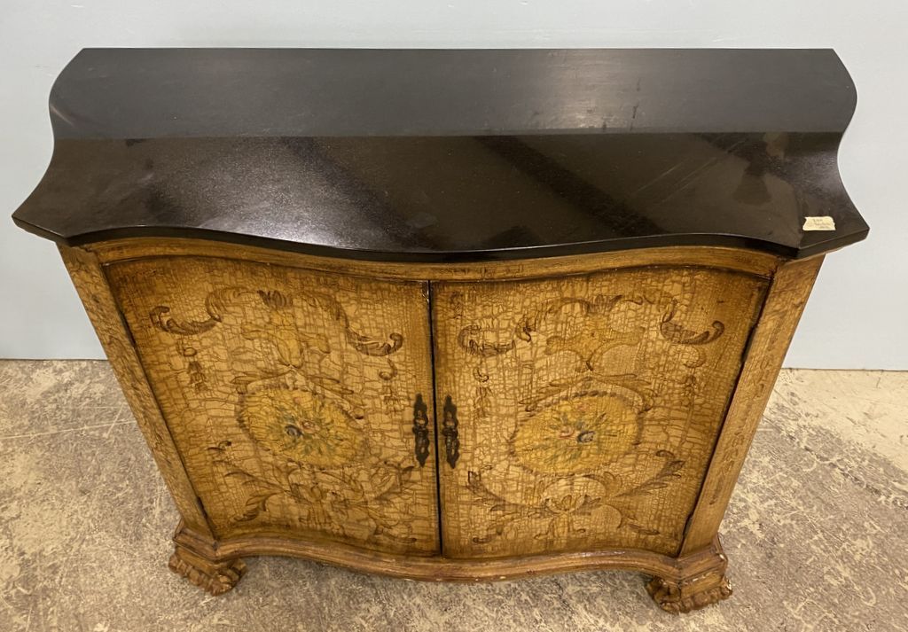 Reproduction Italy Style Wall Commode, faux marble top, double door, aged distressed factory painted, some small chips, 34"h., 48"w., 20"d, Location Right Side 6th Row Reproduction Italy Style Wall Commode, faux marble top, double door, aged distressed factory painted, some small chips, 34"h., 48"w., 20"d, Location Right Side 6th Row