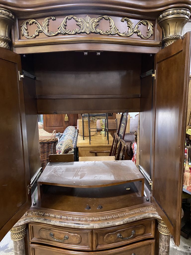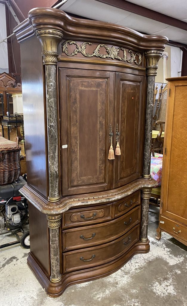 Michael Amini by AICO Marble Accent Entertainment Armoire, Aico's Torino Bedroom Collection, two piece, marble column, very heavy, 88"h., 51"w., 24"d. Location Left Side 1st Rows Michael Amini by AICO Marble Accent Entertainment Armoire, Aico's Torino Bedroom Collection, two piece, marble column, very heavy, 88"h., 51"w., 24"d. Location Left Side 1st Rows