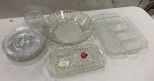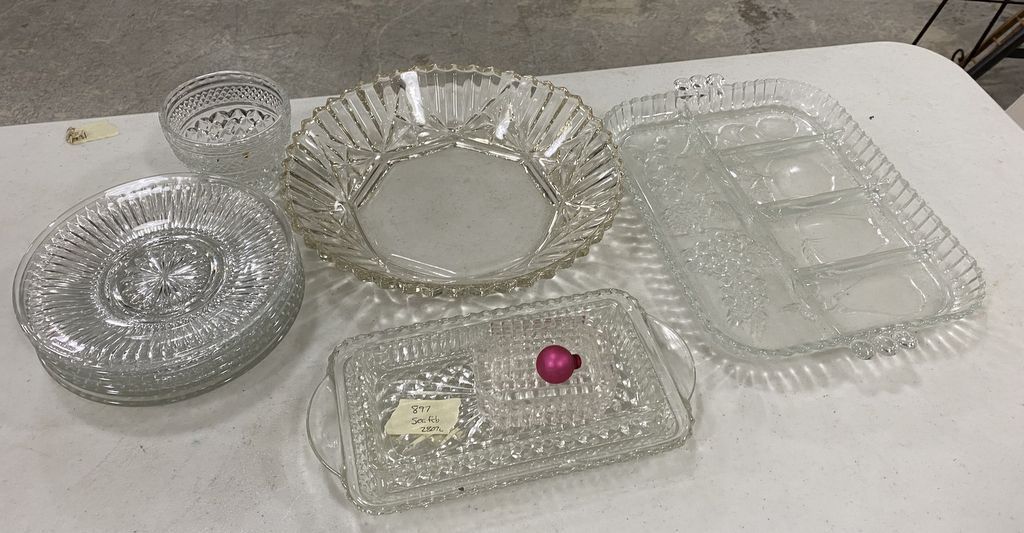 Group of Pressed Glass Serving Pieces, dishes, divided relish tray, butter dish, plates. Back Metal Shelves - Front Side. Group of Pressed Glass Serving Pieces, dishes, divided relish tray, butter dish, plates. Back Metal Shelves - Front Side.