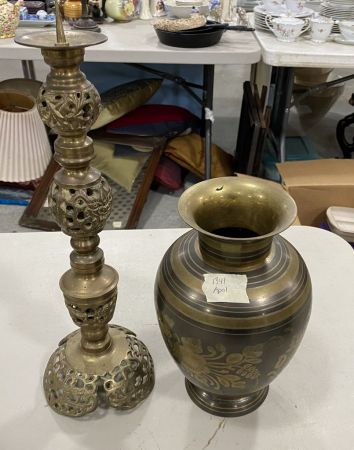 India Brass Vase and Brass Candle Holder, Location: Left Black Metal Shelf India Brass Vase and Brass Candle Holder, Location: Left Black Metal Shelf
