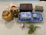 1348 Jewelry Boxes, Blue Porcelain Tray, Trinket, Vases, and Shell