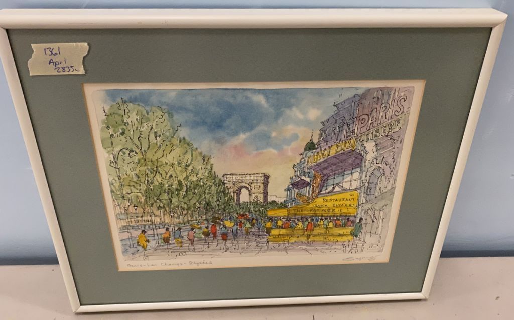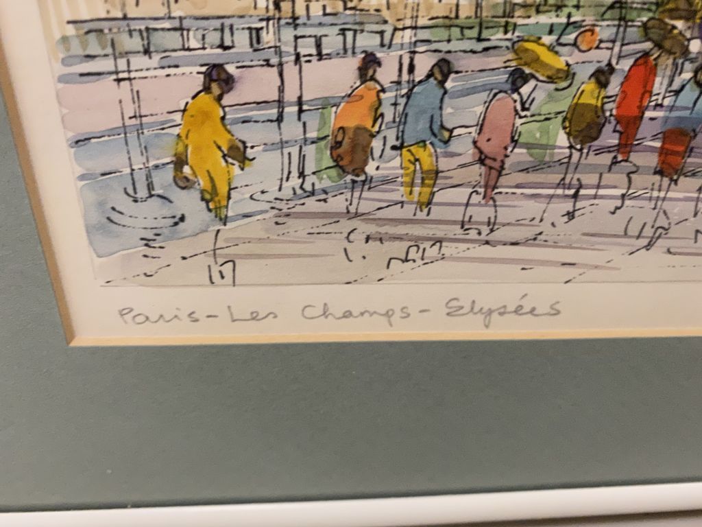 Signed Paris Les Champs Print, matted, framed, 12"h. 15"w. Signed Paris Les Champs Print, matted, framed, 12"h. 15"w.