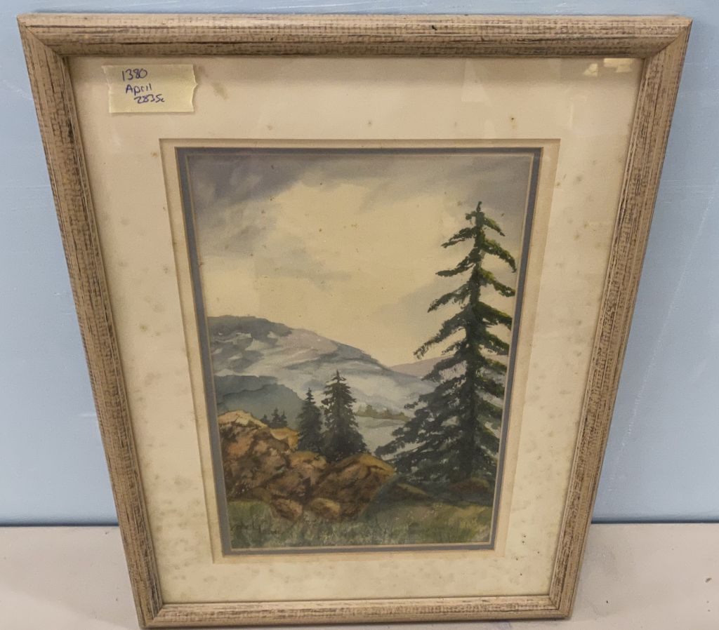 Vintage Landscape Print, matted, framed, 18"h., 13"w. Location: Black Silver Metal Shelves Vintage Landscape Print, matted, framed, 18"h., 13"w. Location: Black Silver Metal Shelves