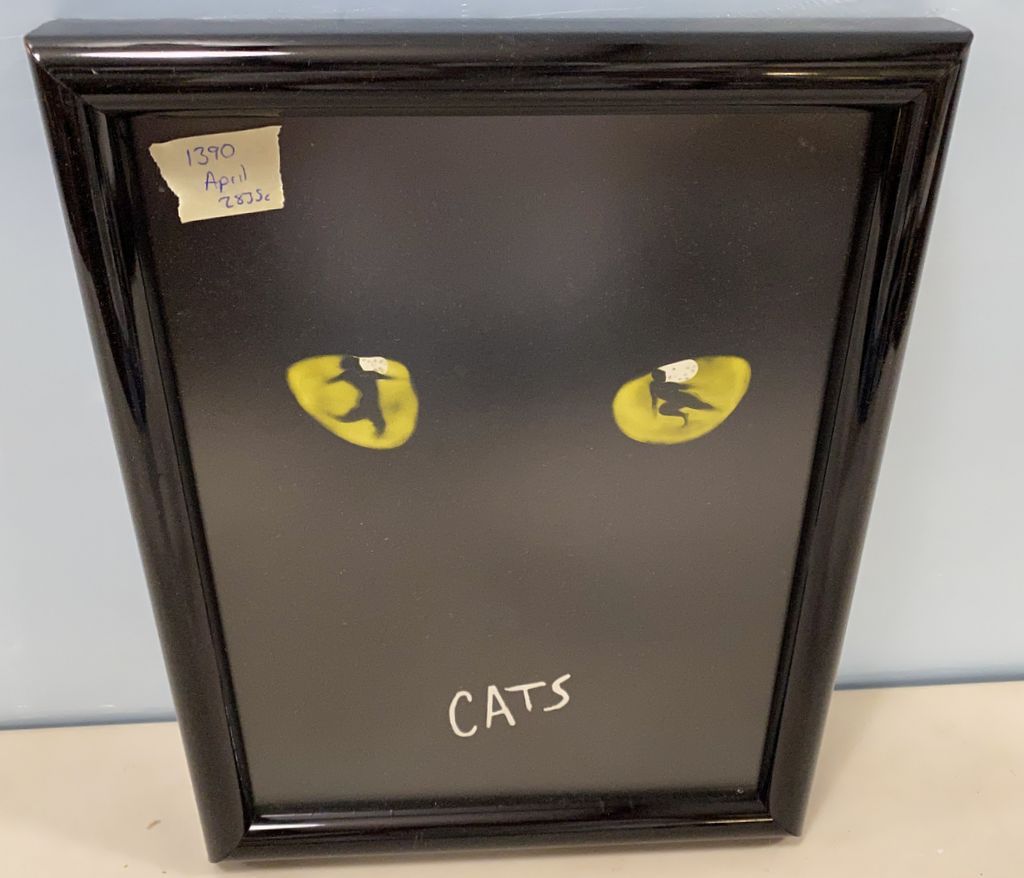 Cats Broadway Poster, framed, 14"h. 10"w. Location: Black Silver Metal Shelves Cats Broadway Poster, framed, 14"h. 10"w. Location: Black Silver Metal Shelves