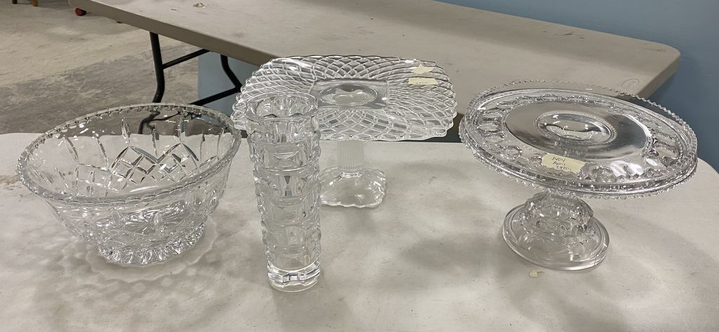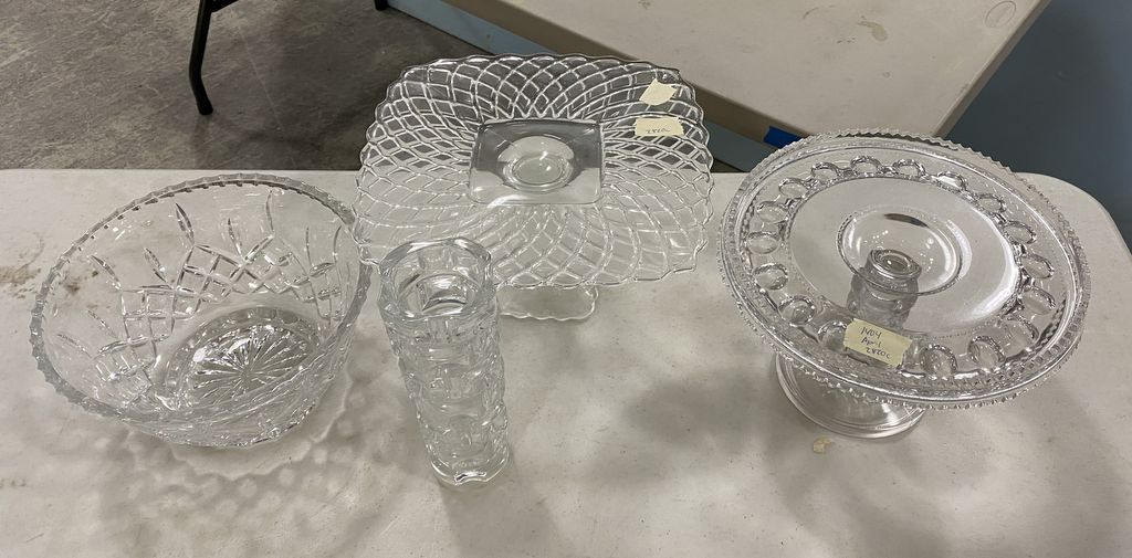 Two Glass Cake Stands, Crystal Serving Bowl, and Glass Vase, Location Front White Shelves, 1st shelf Two Glass Cake Stands, Crystal Serving Bowl, and Glass Vase, Location Front White Shelves, 1st shelf