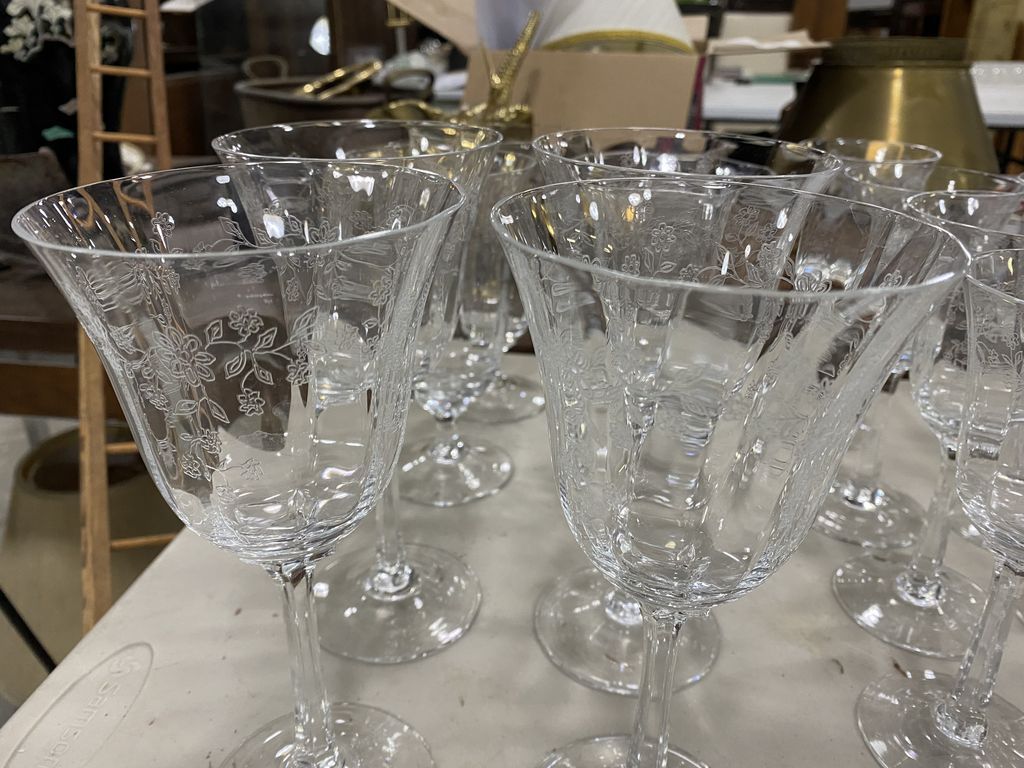 Two different patterns, one etched floral, 15 total, and 6 crystal stemware, Location Front of Screen Two different patterns, one etched floral, 15 total, and 6 crystal stemware, Location Front of Screen
