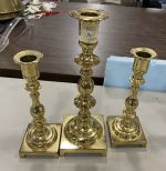 Three Brass Candle Holders, 8"h, Location Front of Screen Three Brass Candle Holders, 8"h, Location Front of Screen