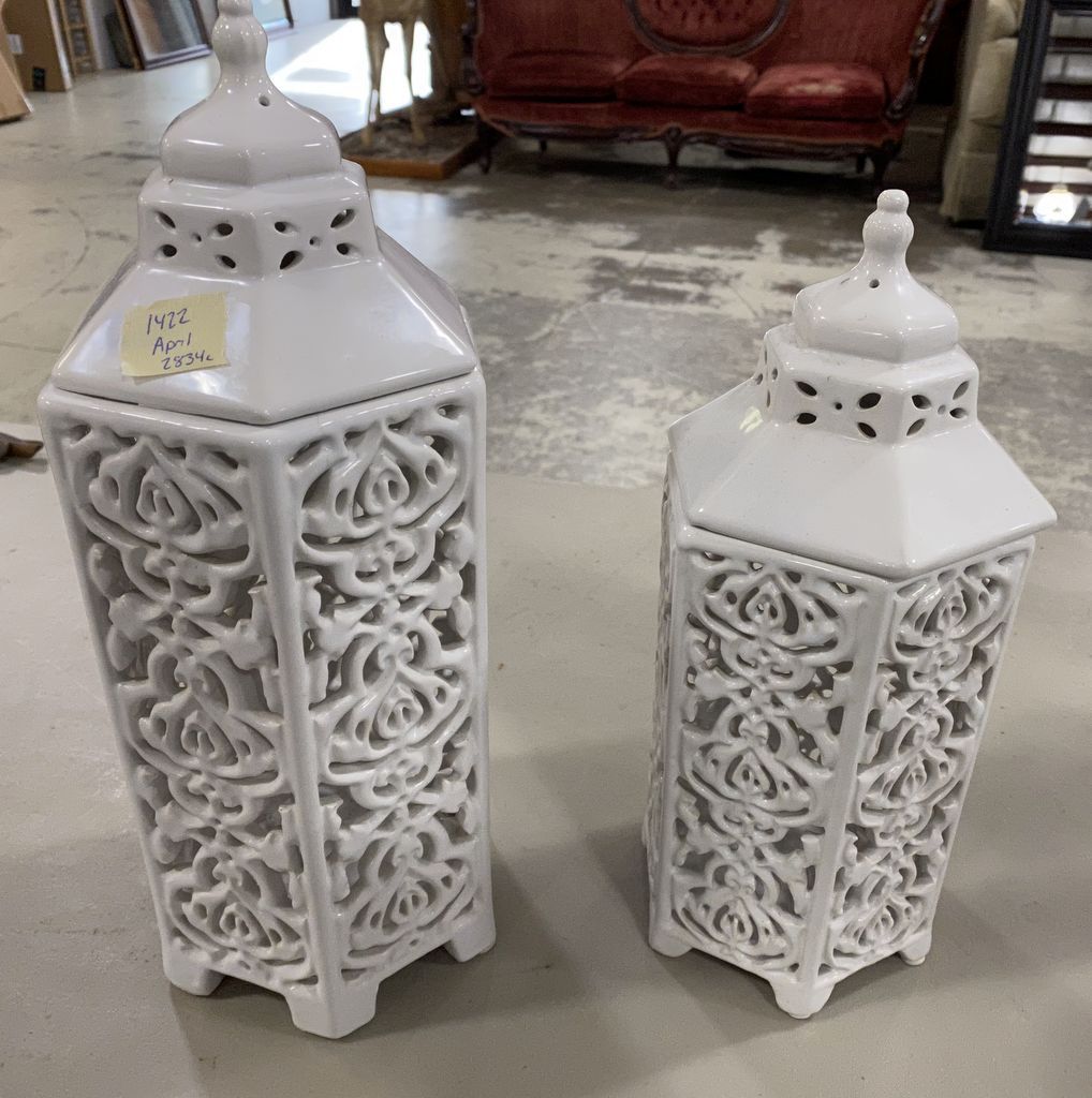 White Porcelain Candle Holders, made in China, 14"h. Location Front Curved Glass Showcase White Porcelain Candle Holders, made in China, 14"h. Location Front Curved Glass Showcase