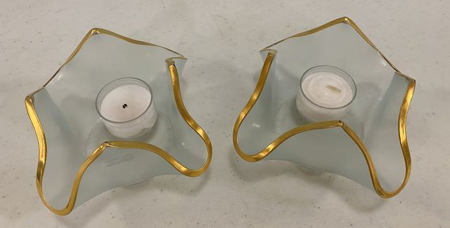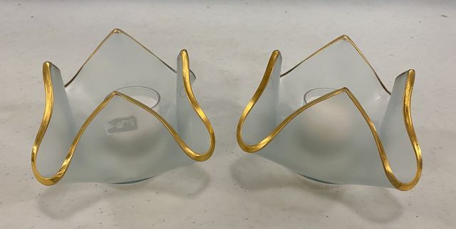 Pair of Annie Glass Votive Candle Holders, gold, USA HV100, 3"h., 4"w. Pair of Annie Glass Votive Candle Holders, gold, USA HV100, 3"h., 4"w.
