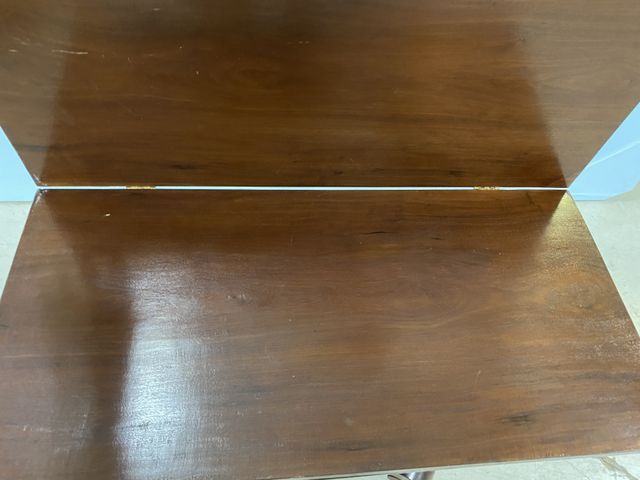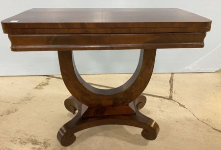 Antique Empire Style Wall Console Table, burl mahogany, lift top game table, pedestal base, few missing veneer pieces, 29"h., 34"w., 17"d. Antique Empire Style Wall Console Table, burl mahogany, lift top game table, pedestal base, few missing veneer pieces, 29"h., 34"w., 17"d.