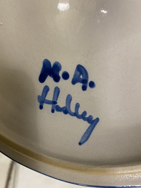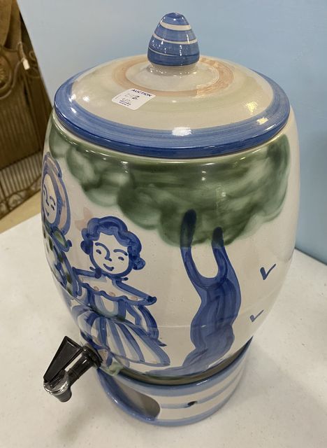 M.A. Hadley Stoneware Crock Dispenser, three piece, lid, container, base, signed, hand painted, good condition, 18"h. M.A. Hadley Stoneware Crock Dispenser, three piece, lid, container, base, signed, hand painted, good condition, 18"h.