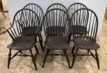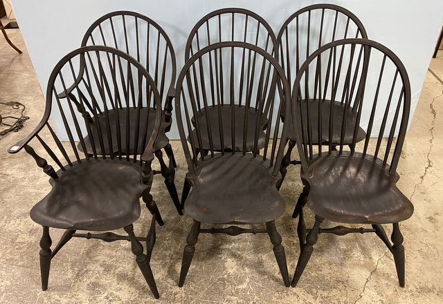 Six Windsor style dining chairs, painted, two arms, four sides, spindle back, marked WCW, good condition. Six Windsor style dining chairs, painted, two arms, four sides, spindle back, marked WCW, good condition.