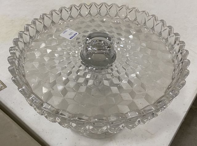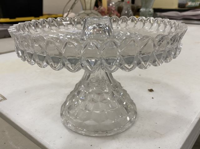 Fostoria American Clear Cake Stand, two piece, pedestal base, no damage, 6 1/2"h., 10"dia. Fostoria American Clear Cake Stand, two piece, pedestal base, no damage, 6 1/2"h., 10"dia.